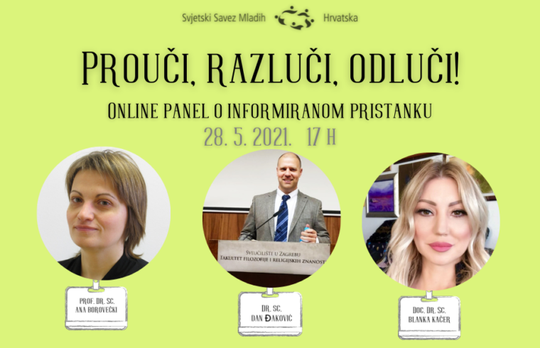 Svjetski savez mladih Hrvatska najavljuje održavanje online panel rasprave o informiranom pristanku, koja će se, u sklopu događaja “PROUČI, RAZLUČI, ODLUČI!”, u organizaciji SSMH, održati u petak, 28. svibnja 2021. u 17.00 sati.