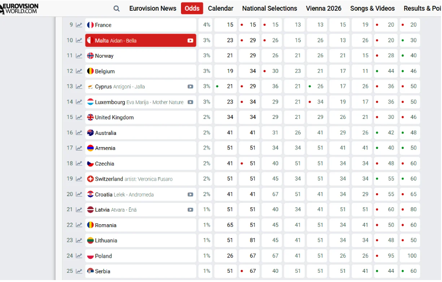 Kada je riječ o Hrvatskoj, koju predstavlja sastav Lelek s pjesmom “Andromeda”, trenutačno se nalazi na 20. mjestu od ukupno 35 zemalja, s oko dva posto šanse za pobjedu. Prema kladionicama, koeficijenti za Hrvatsku najčešće su u rasponu od oko 29 do 67, što je smješta u donji dio sredine ljestvice favorita. U ranijim verzijama prognoza Hrvatska je bila na 17. i 19. mjestu, što znači da je proteklih tjedana došlo do blagog preslagivanja na kladioničarskoj ljestvici. Iako Hrvatska zasad nije među najvećim favoritima, njezin položaj ostaje stabilan i moguće je da se dalje mijenja kako se približava svibanj i sami nastupi.