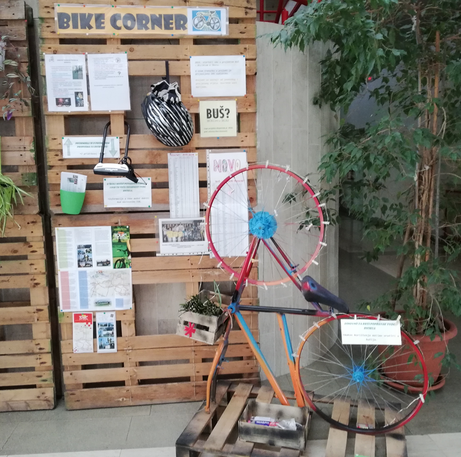 U auli škole postoji Bike Corner na kojem se nalaze sve informacije o projektu – povijest, logo, tijek projekta. Ovdje je također letak o prometnim propisima te informacija da učenici mogu posuditi lokot za sigurnost bicikla. Postoji i mala „biciklpopravljaonica“ za potrebe brzog popravka bicikla. Na Bike Corneru su i svi naši dosadašnji pobjednici u projektu.