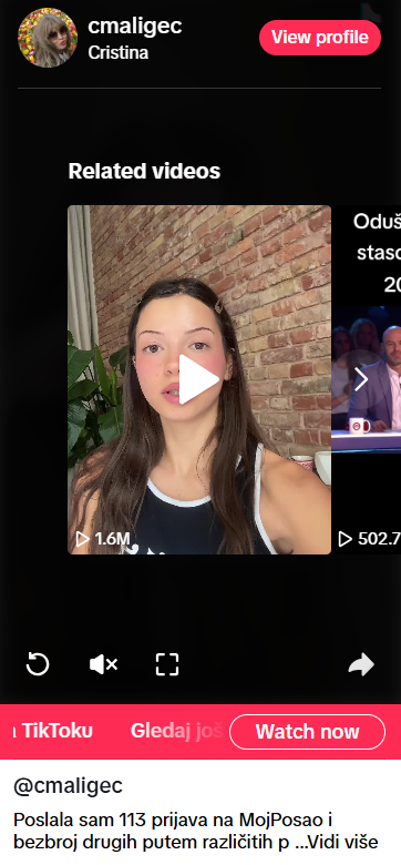 “Kažu da se trud isplati. Ja se trudim već godinu dana. Ponekad je stvarno teško vjerovati da će biti bolje…” napisala je mlada Hrvatica pod imenom Cristina na TikToku, u opisu videa u kojem pokazuje kako je poslala čak 113 molbi za posao, ali je dosad nisu pozvali ni na jedan razgovor.