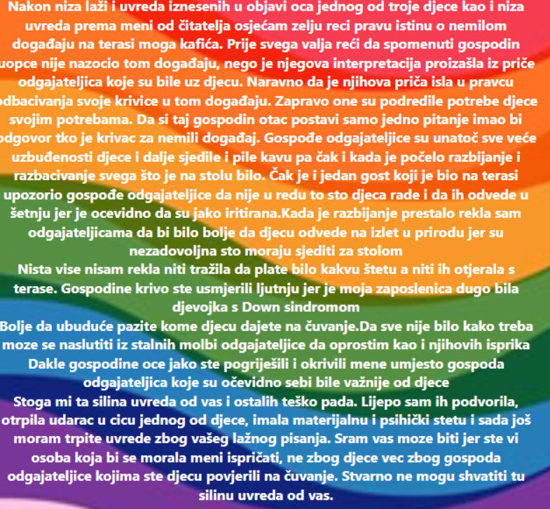 “Stara latinska sentencija kaze ….neka se sasluša i druga strana. Nakon niza laži i uvreda iznesenih u objavi oca jednog od troje djece kao i niza uvreda prema meni od čitatelja osjećam želju reći pravu istinu o nemilom događaju na terasi moga kafića. Prije svega valja reći da spomenuti gospodin uopće nije nazočio tom događaju, nego je njegova interpretacija proizašla iz priče odgajateljica koje su bile uz djecu. Naravno da je njihova priča isla u pravcu odbacivanja svoje krivice u tom događaju. Zapravo one su podredile potrebe djece svojim potrebama. Da si taj gospodin otac postavi samo jedno pitanje imao bi odgovor tko je krivac za nemili događaj. Gospođe odgajateljice su unatoč sve veće uzbuđenosti djece i dalje sjedile i pile kavu pa čak i kada je počelo razbijanje i razbacivanje svega što je na stolu bilo. Čak je i jedan gost koji je bio na terasi upozorio gospođe odgajateljice da nije u redu to sto djeca rade i da ih odvede u šetnju jer je očevidno da su jako iritirana. Kada je razbijanje prestalo rekla sam odgajateljicama da bi bilo bolje da djecu odvede na izlet u prirodu jer su nezadovoljna sto moraju sjediti za stolom.