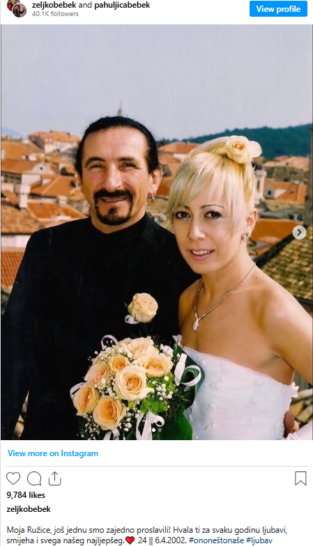 Uz čestitku svojoj dugogodišnjoj partnerici, Bebek je podijelio i fotografiju s njihova vjenčanja održanog 2002. godine na dubrovačkoj tvrđavi Minčeti, prisjetivši se početaka njihove ljubavne priče. Objavio je i obiteljsku fotografiju sa sinom Zvonimirom i kćeri Katarinom, s kojima su proslavili ovu posebnu obljetnicu.