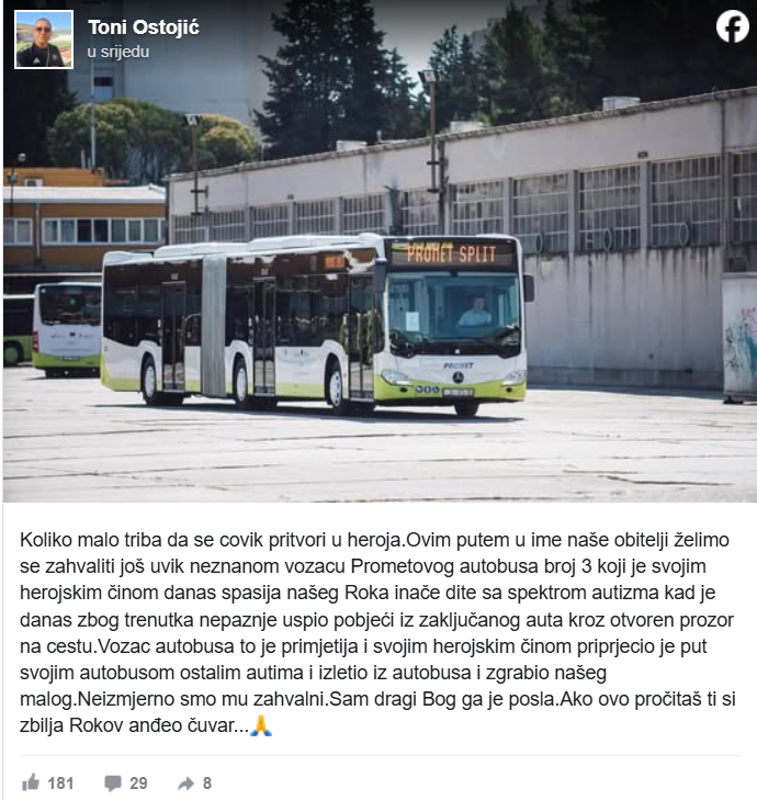 Naime, u trenutku nepažnje jedan se maleni dječak, inače u spektru autizma, u trenutku nepažnje iskrao kroz otvoren prozor zaključanog automobila svojih roditelja i – pobjegao na cestu. Moglo je to, svjesni su svi, završiti tragično, da se tu nije našao jedan autobus, odnosno vozač autobusa. Vozač Prometa, splitskog gradskog prijevoznika, vidio je malenog Roka, pa svojim autobusom prepriječio put svim drugim vozilima, izašao na prometnu i opasnu cestu i uhvatio Roka, prenijela je Slobodna Dalmacija.