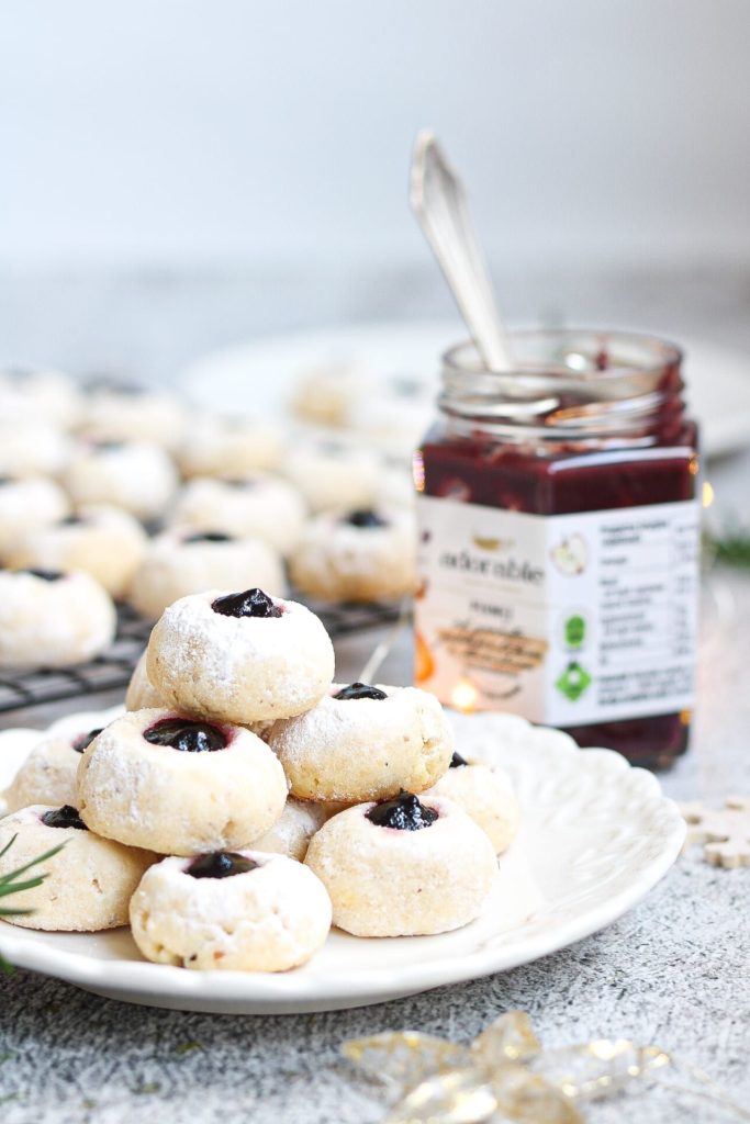 Hladno tijesto podijelite na dva jednaka dijela (dok radite kuglice od jednog dijela drugi stavite u hladnjak), rukama otkidajte komadiće tijesta i oblikujte kuglice veličine oraha. Dobivene kuglice stavljate na lim za pečenje obložen papirom za pečenje. U svakoj kuglici drškom kuhače utisnite udubljenje. Pecite ih u prethodno ugrijanoj pećnici na 180 stupnjeva 15 minuta.