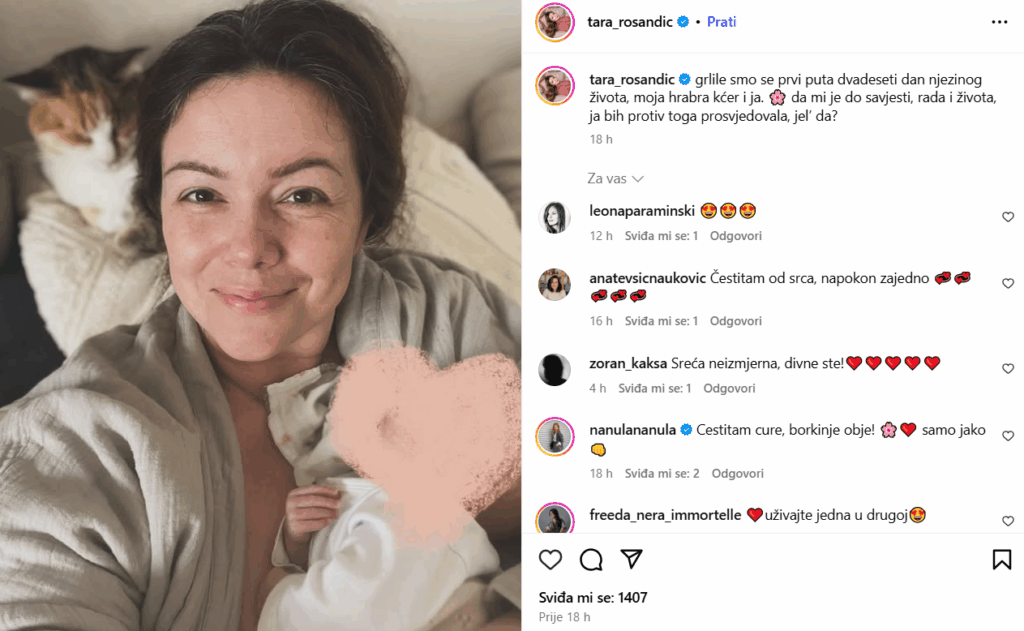 “Grlile smo se prvi puta dvadeseti dan njezinog života, moja hrabra kćer i ja. Da mi je do savjesti, rada i života, ja bih protiv toga prosvjedovala, jel’ da?”, poručila je Tara uz fotografiju na kojoj kćerkicu drži u naručju.