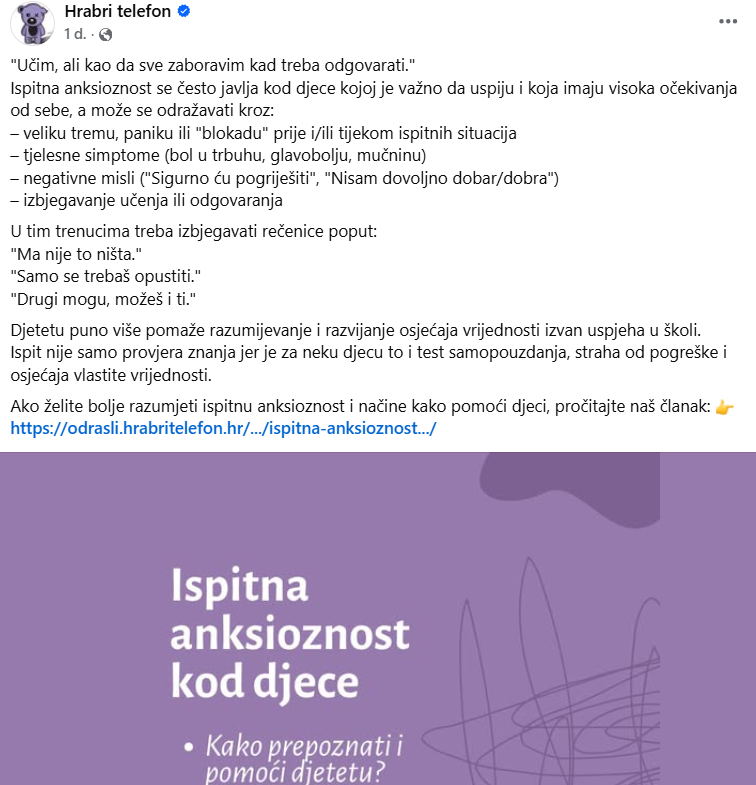 “‘Učim, ali kao da sve zaboravim kad treba odgovarati’. Ispitna anksioznost se često javlja kod djece kojoj je važno da uspiju i koja imaju visoka očekivanja od sebe, a može se odražavati kroz: veliku tremu, paniku ili ‘blokadu’ prije ili tijekom ispitnih situacija; tjelesne simptome – bol u trbuhu, glavobolju, mučninu; negativne misli – ‘sigurno ću pogriješiti’, ‘nisam dovoljno dobar/dobra’ kao i izbjegavanje učenja ili odgovaranja”, napisali su iz Hrabrog telefona na svom Facebook profilu.
