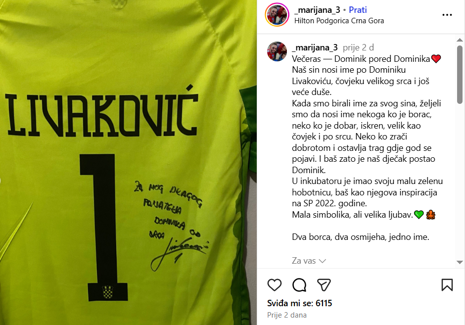Njegova majka Marijana Rakočević podijelila je emotivnu priču na društvenim mrežama i otkrila kako je njezin sin, velik obožavatelj Dominika Livakovića, prije utakmice imao priliku upoznati svog idola. Livaković se s dječakom susreo u hotelu hrvatske reprezentacije, gdje je mali Dominik dobio potpisani dres i nekoliko trenutaka druženja koje je njegova obitelj opisala kao ostvarenje sna, prenosi tportal.