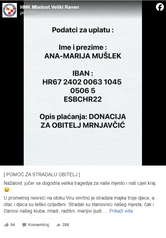 “Nažalost, u nedjelju se dogodila velika tragedija za naše mjesto i naš cijeli kraj. U prometnoj nesreći na otoku Viru smrtno je stradala majka troje djece, a otac i djeca su teško ozlijeđeni. Stradali su stanovnici našeg mjesta, čak i članovi našeg kluba..mladi, radišni, marljivi ljudi. Kako bismo pomogli stradaloj obitelji u suradnji s mještanima i velikim brojem ljudi koji žele pomoći u Erste banci je otvoren račun na koji se mogu uplaćivati sredstva za pomoć obitelji.”