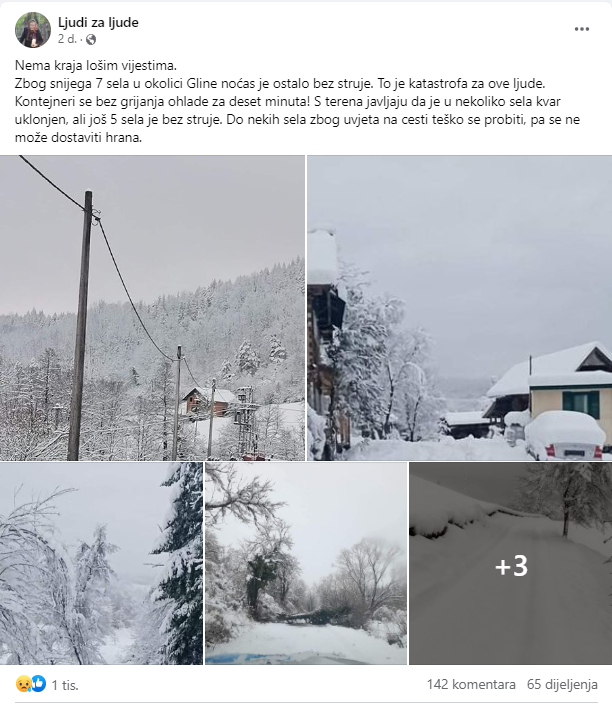 “Nema kraja lošim vijestima. Zbog snijega 7 sela u okolici Gline noćas je ostalo bez struje. To je katastrofa za ove ljude. Kontejneri se bez grijanja ohlade za deset minuta! S terena javljaju da je u nekoliko sela kvar uklonjen, ali još 5 sela je bez struje. Do nekih sela zbog uvjeta na cesti teško se probiti, pa se ne može dostaviti hrana”, napisali su prije dva dana Ljudi za ljude na svojoj Facebook stranici.