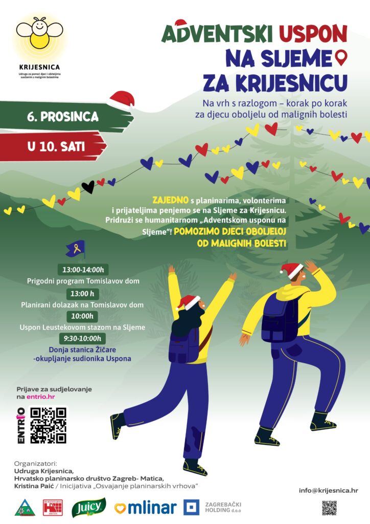 Zagreb ove godine dobiva novu humanitarnu adventsku aktivnost: Adventski uspon na Sljeme za Krijesnicu, prvu akciju koja spaja planinarenje i prikupljanje pomoći za djecu oboljelu od malignih bolesti. Održat će se 6. prosinca, na blagdan svetog Nikole, a cilj joj je okupiti građane koji žele dio adventskog raspoloženja provesti izvan centra grada, na stazi, uz konkretan doprinos humanitarnoj svrsi.