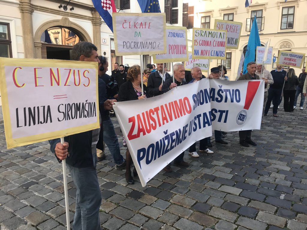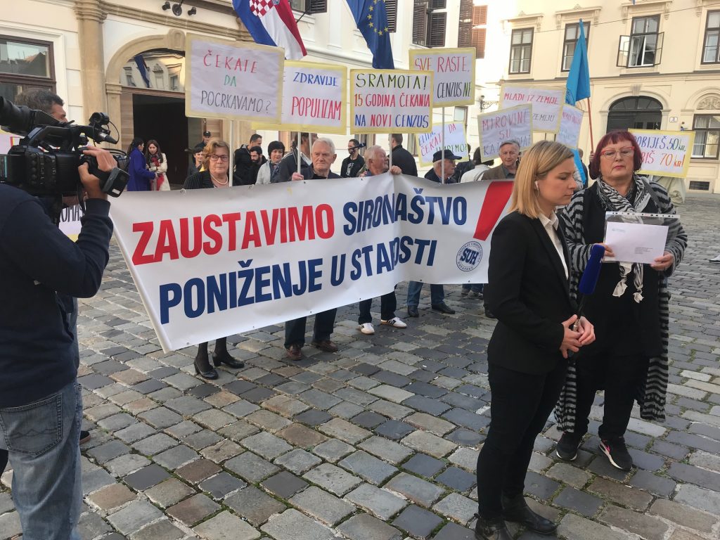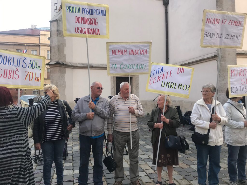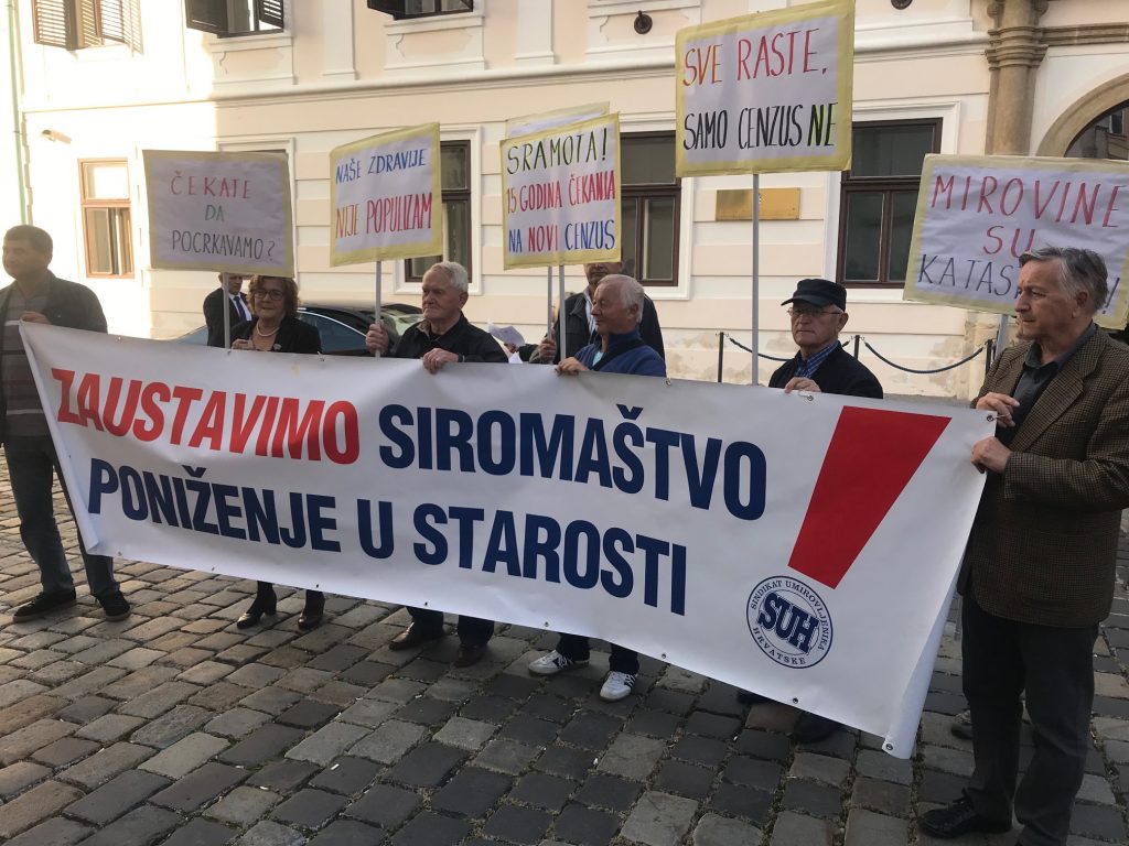 Zbog ignoriranja njihovih zahtjeva da se poveća cenzus za dopunsko zdravstveno osiguranje, umirovljenici su se okupili u četvrtak u 9.30 sati kako bi uručili otvoreno pismo Vladi. Nosili su i brojne transparente koji jasno izražavaju njihove stavove: “Dobiješ 50 kuna, gubiš 70 kuna”, “Naše zdravlje nije populizam”, “Sve raste samo cenzus ne”, “Elita, čekate da umremo!”, “Cenzus = linija siromaštva”, “Sramota! 15 godina čekanja na novi cenzus” i “Protiv poskupljenja dopunskog osiguranja”.
