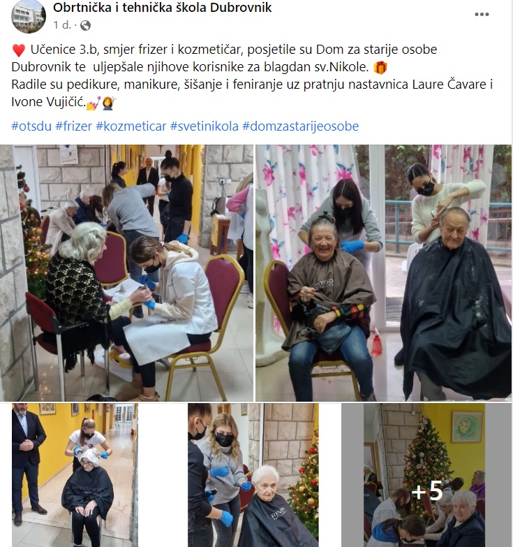 Ove su buduće kozmetičarke i frizerke svratile u Dom za starije osobe Dubrovnik kako bi razveselile korisnice i korisnike povodom blagdana svetog Nikole. Pedikurom, manikurom, šišanjem i feniranjem izmamile su im osmijeh na lice. Bila je to i prilika za opušteno druženje starije i mlađe generacije.